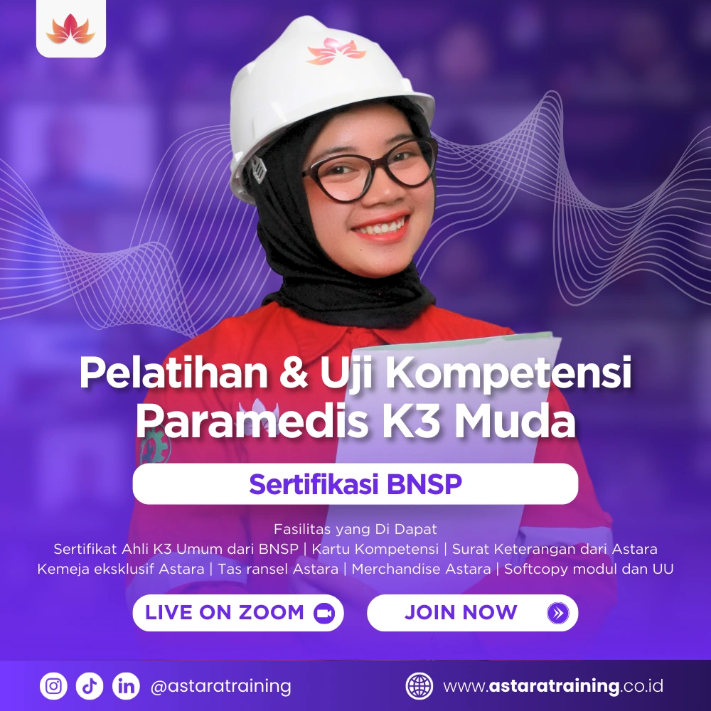 Pelatihan Paramedis K3 Muda BNSP adalah program pelatihan yang bertujuan untuk membekali peserta dengan pengetahuan dan keterampilan dasar dalam memberikan pertolongan pertama dan penanganan medis awal di lingkungan kerja. Pelatihan ini fokus pada pengembangan kemampuan peserta untuk melaksanakan pelayanan kesehatan kerja, mengembangkan program keselamatan kerja, meminimalisir penyakit akibat kerja dll.
